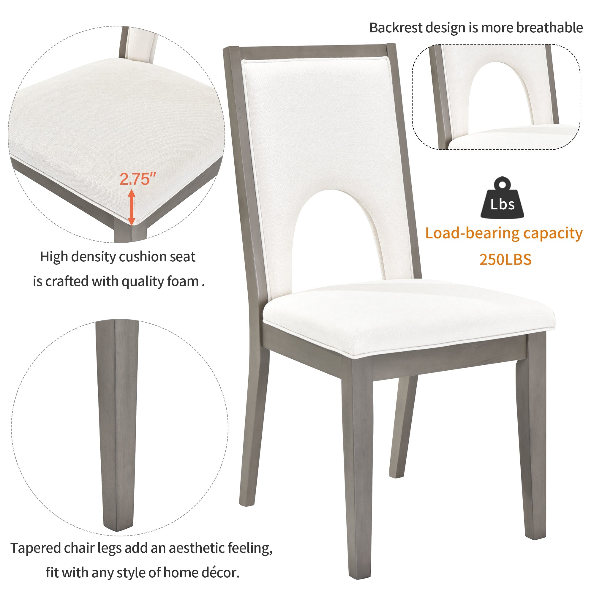 • The high density cushion seat is crafted with quality foam for extended comfort while featuring a 2.75-inch thickness, offer a soft seating experience for you to enjoy a meal in a relaxed status. Thick upholstered backrests of chair sets are in line with ergonomic design, thus bringing superb comfort. Tapered chair legs add an aesthetic feeling, fit with any style of home décor. Perfect for family meals or gatherings in your dining room or kitchen.