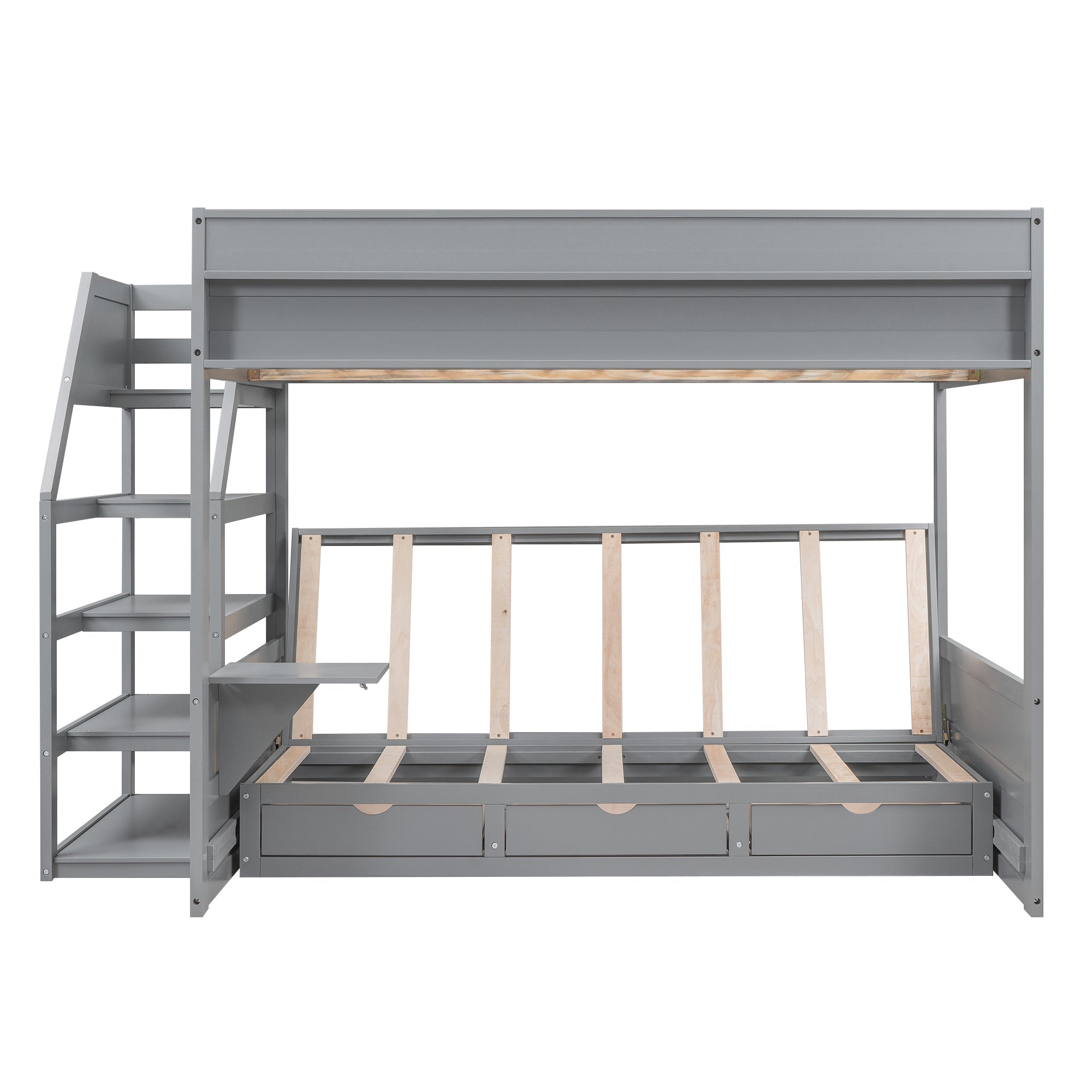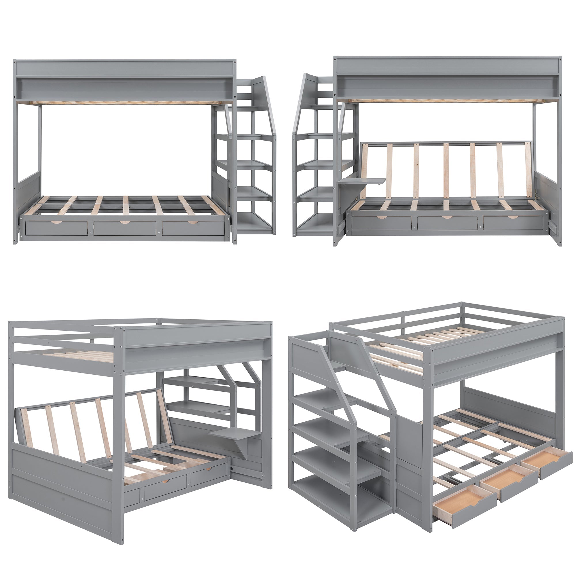 Wood Full Size Convertible Bunk Bed with Storage Staircase, Bedside Table, and 3 Drawers, Gray