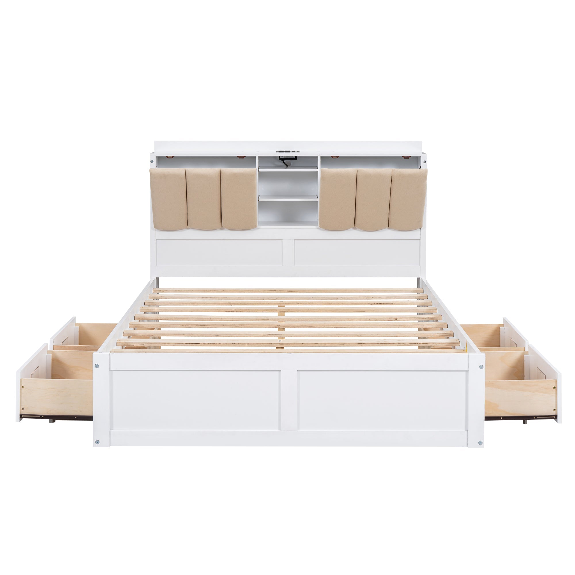 Wood Full Size Platform Bed with Storage Headboard and 4 Drawers, White