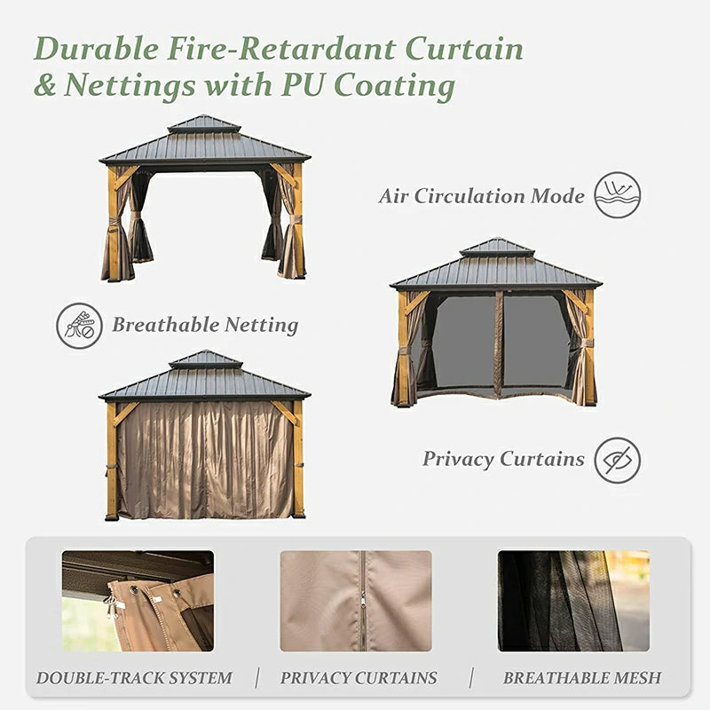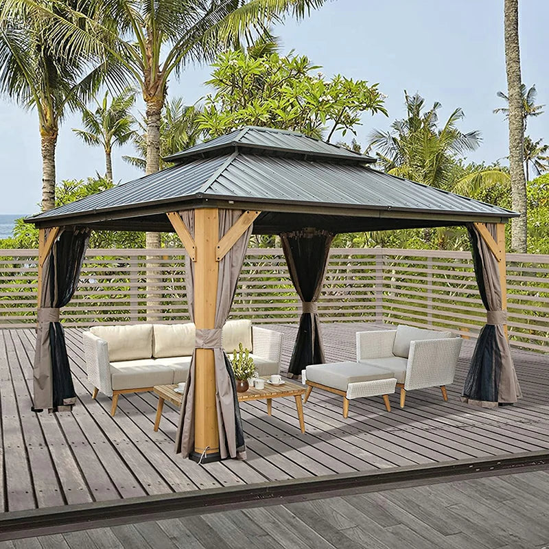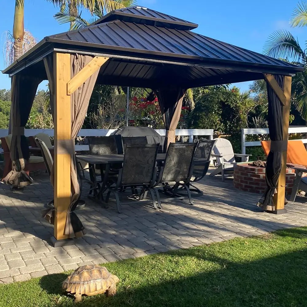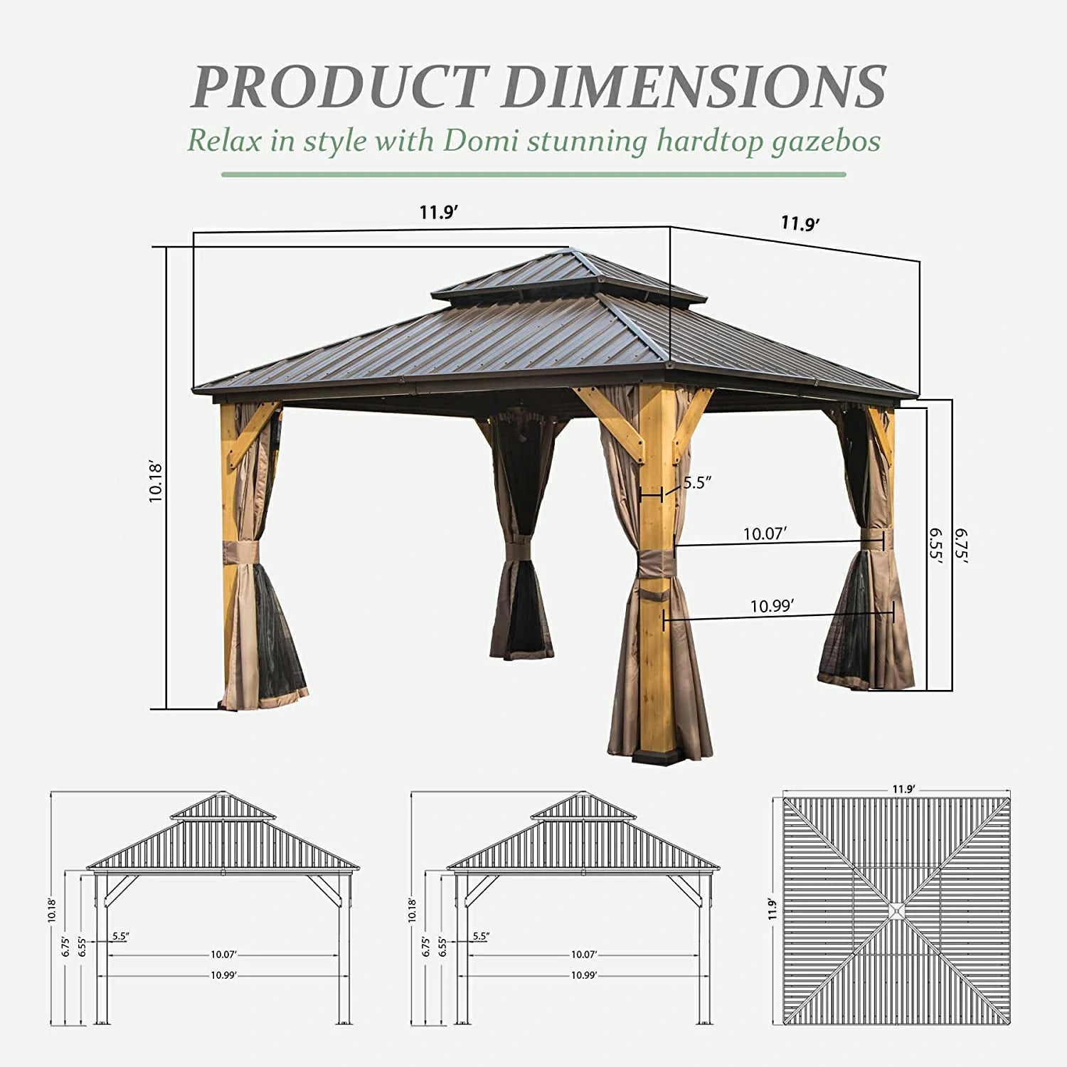Welcome to your very own outdoor oasis with the Domi Outdoor Living Wood Gazebo. Designed to elevate your patio, backyard, deck, or lawns, this gazebo combines elegant aesthetics with exceptional functionality. Crafted with a sturdy cedar wood frame and a galvanized steel double roof, it offers the perfect balance of durability and beauty. Domi Outdoor Living gazebo cedar wood is naturally resistant to rot, decay, and insect damage, making it an excellent choice for outdoor structures that need to withstand the elements. The hard top gazebo’s cedar wood frame can be easily stained or painted to match the existing décor of a backyard, making it a versatile option for any outdoor space.