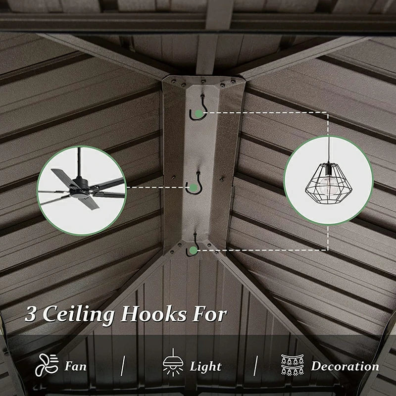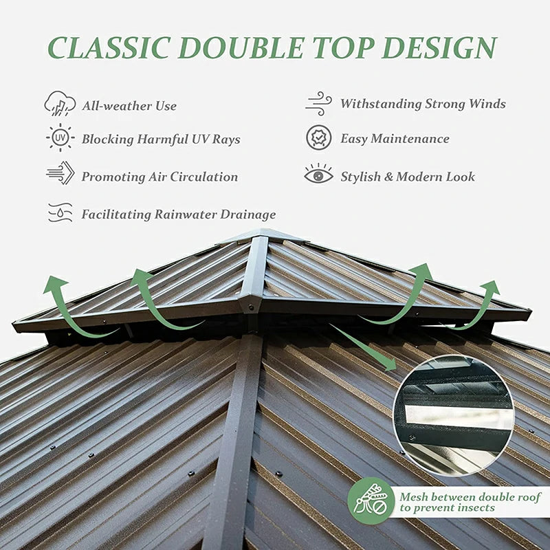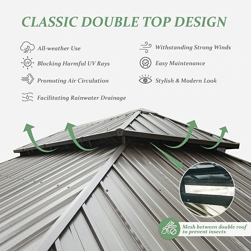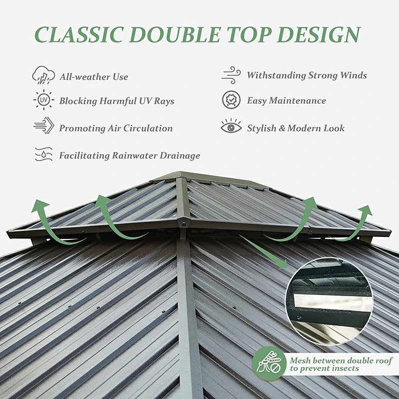 The superior craftsmanship and attention to detail shine through in every aspect of this gazebo. The galvanized steel double roof not only adds an air of sophistication, but it also offers reliable protection from the elements. Rain or shine, you can comfortably relax beneath the sturdy shelter of this gazebo.