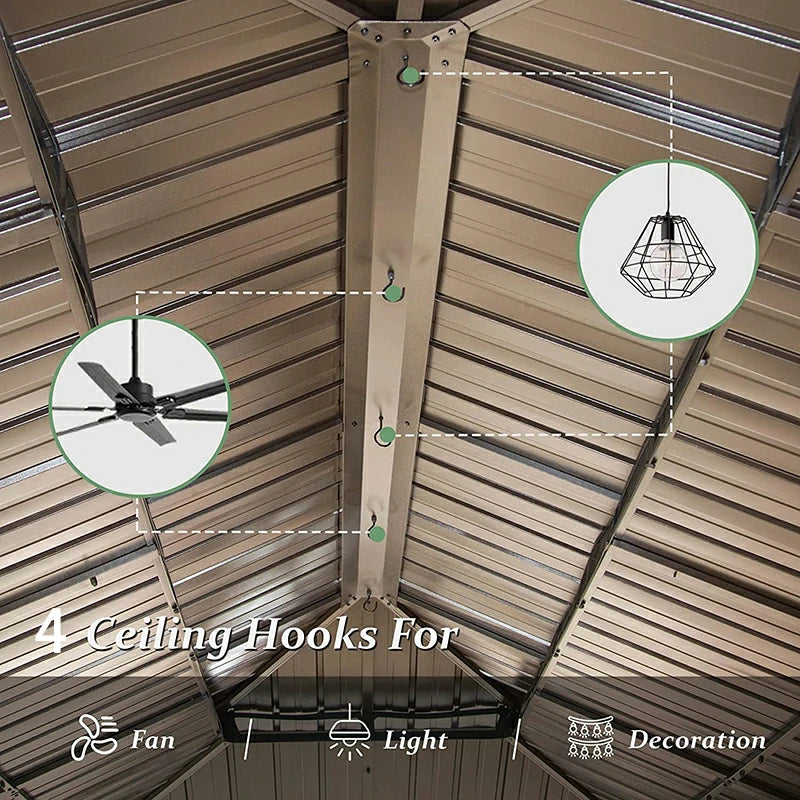 Gazebo Total Weight: 360.9 LBS(12X12 ft), 398.6 LBS(12×14 ft), 465.4 LBS(12×20 ft)