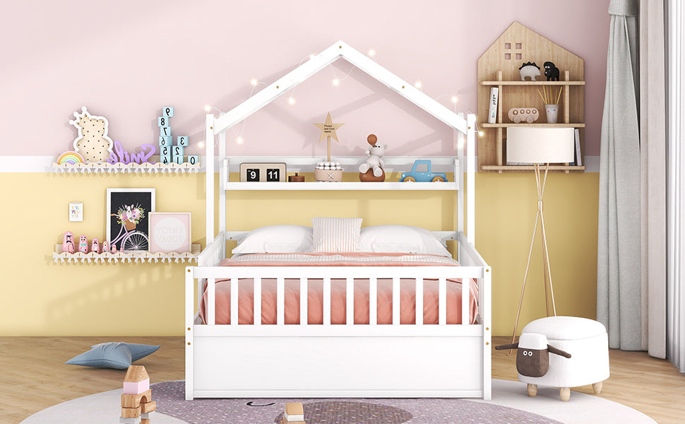 Wooden Full Size House Bed with Twin Size Trundle,Kids Bed with Shelf,White