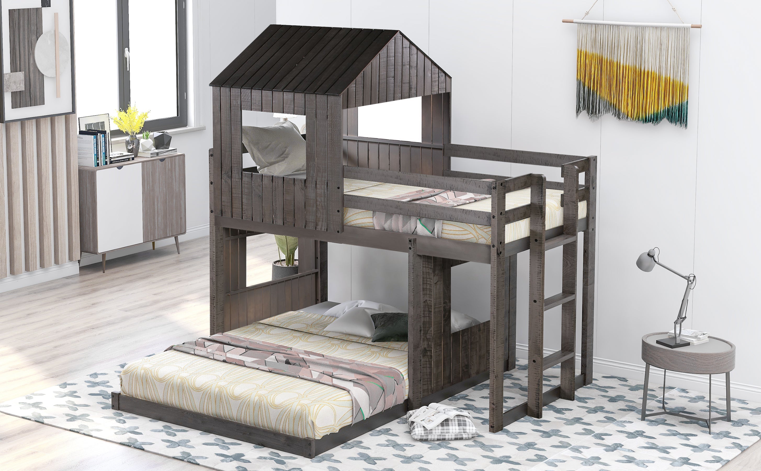 Give the family in your life a playhouse that will bring hours of fun combined with a fully functional bunk bed for the perfect two-in-one bedroom addition. With a design loved by parents and family alike, this bunk is completed with a simple silhouette and natural weathered wood grain to serve as a tasteful statement piece in your family bedroom that they can enjoy for hours on end. Crafted as a cabin-inspired playhouse with square windows on the top and bottom bunk, this bed doubles as a semi-enclosed play place to let the imagination of your family run wild. Enjoy this bunk for years to come with its durable build, manufactured with quality lumber and pinewood to withstand horseplay, scratching and other untimely wear. Assemble according to your personal preference, with assembly options allowing for the bottom bed to be on the left or right side in accordance to your room layout. Comes complete with thick slats to preserve the life of your mattress.
